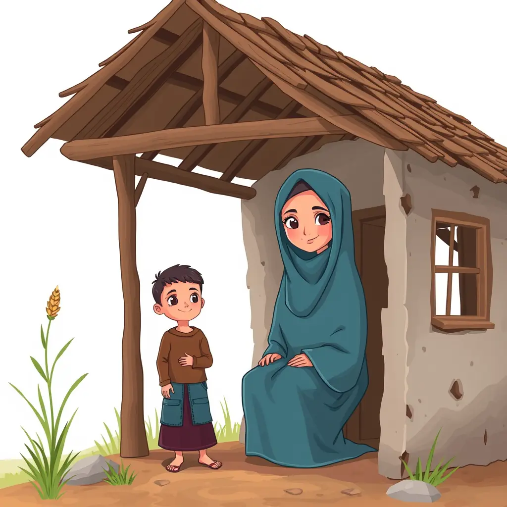 اجعل ام مسلمة مع طفلها في بيت قديم بدون سقف على شكل كارتون خلفية شفاف