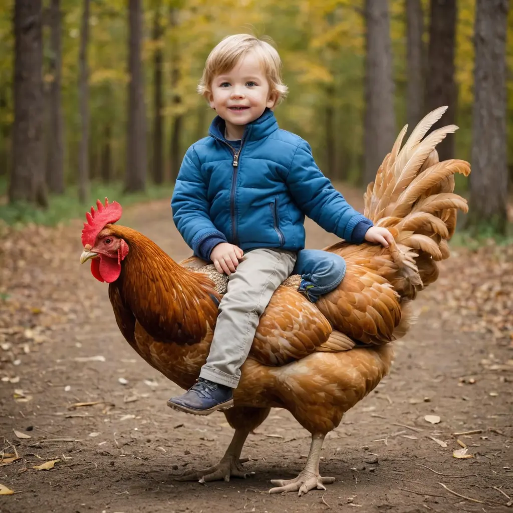 طفل صغير على دجاجه كبيره