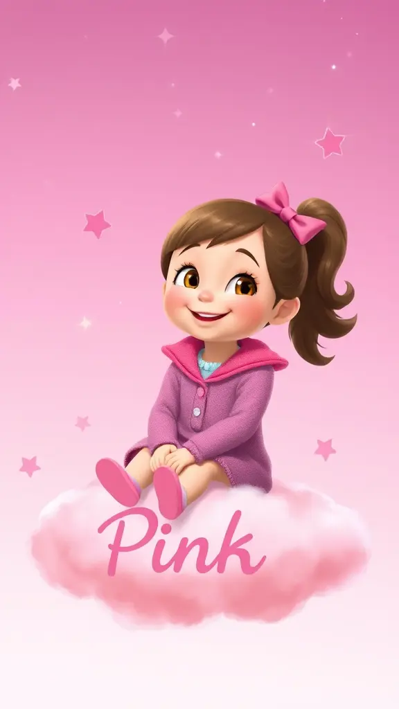 اريد صوره لبنت صغيرة مبتسمة، ترتدي ملابس زهريه وتجلس فوق غيمه زهريه في السماء وحولها نجوم زهرية اللون، مكتوب على االغيمة Pink .أريد الصوره Disney Pixar