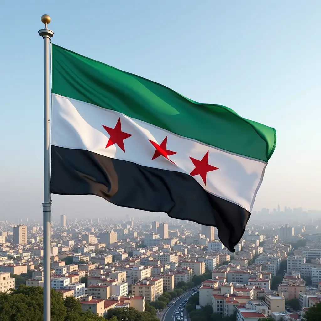علم سوريا المكون من اللون الأخضر في الجزء العلوي والأسود في الجزء السفلي وثلاث نجوم حمراء في المنتصف يرفرف فوق مدينه جميله