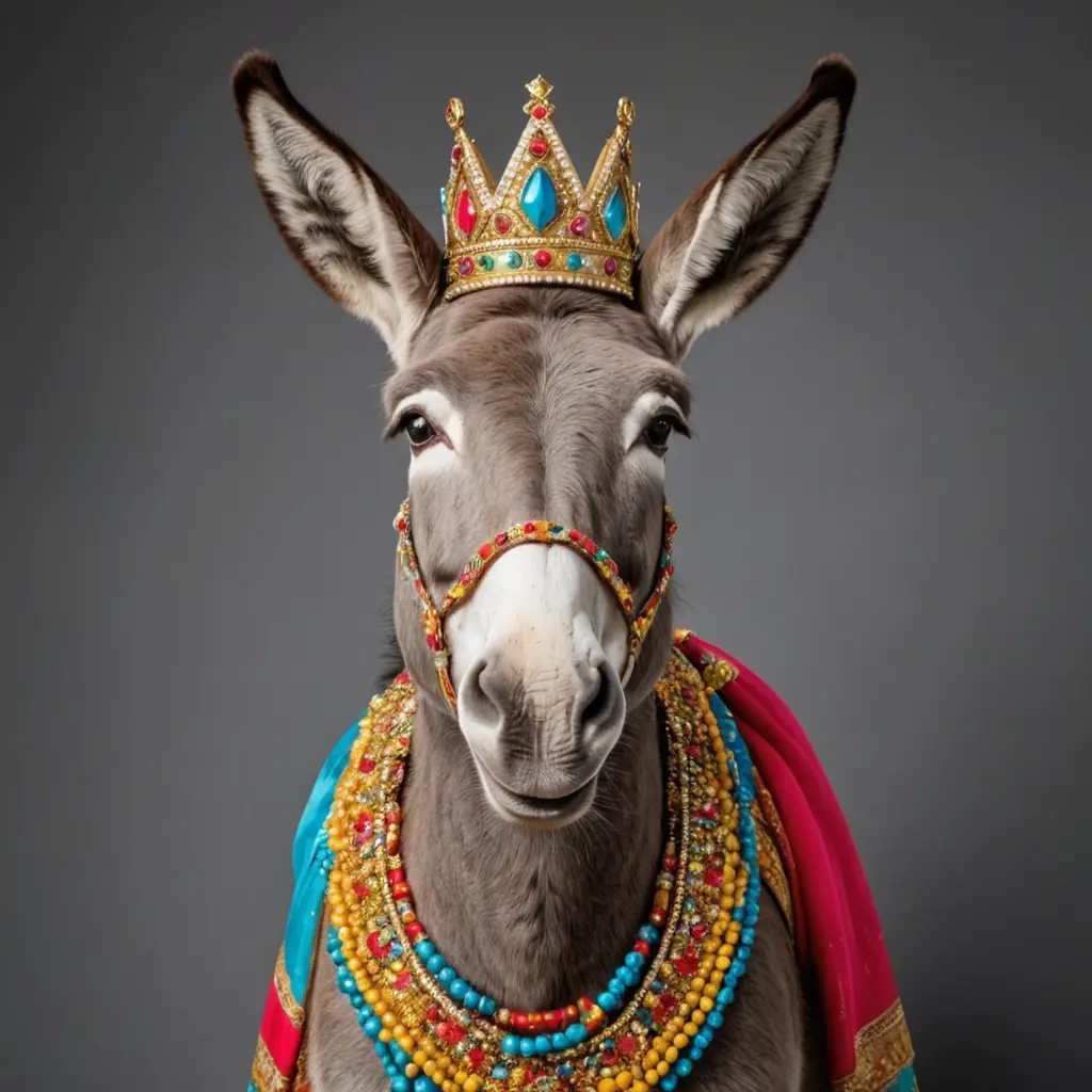 حمار يضحك عليه ملابس زاهية جميلة وجواهر وعلى رأسه تاج