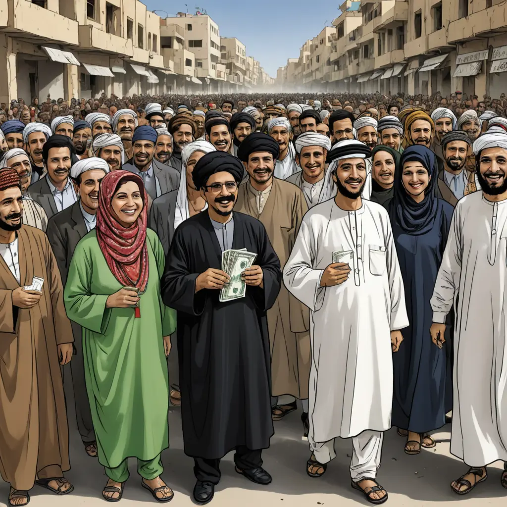 رسم كاريكاتير ساخر  لانتعاش اقتصادي   في ليبيا بعد أزمة خانقة في ارتفاع الدولار  وهناك عدد قليل  الأشخاص يلبسون لباسا ليبيا  فرحون بهذا الانتعاش
