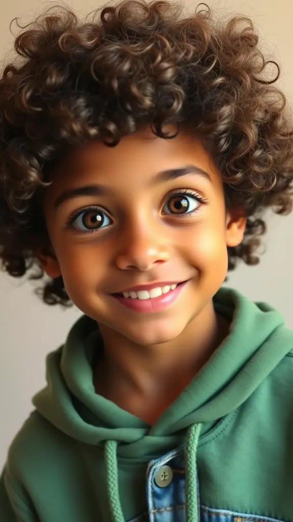 ولد حقيقي عمره 10 سنوات شعره كيرلي وكثيف لكن مرتب وعيونه وساع وبنية زيي وابتسامته تجنن لكن شفايفه نحيفه شوي بشرته قمحية فاتحة لابس هودي اخضر وسروال جنز ازرق فضفاض وبدون كاب
