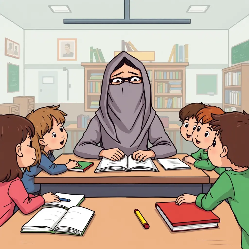 بشكل كرتوني معلمة محجبة تجلس على طاولة ومعاها ١٠ اطفال أمامهم كتب وأقلام والخلفية مركز تعليمي