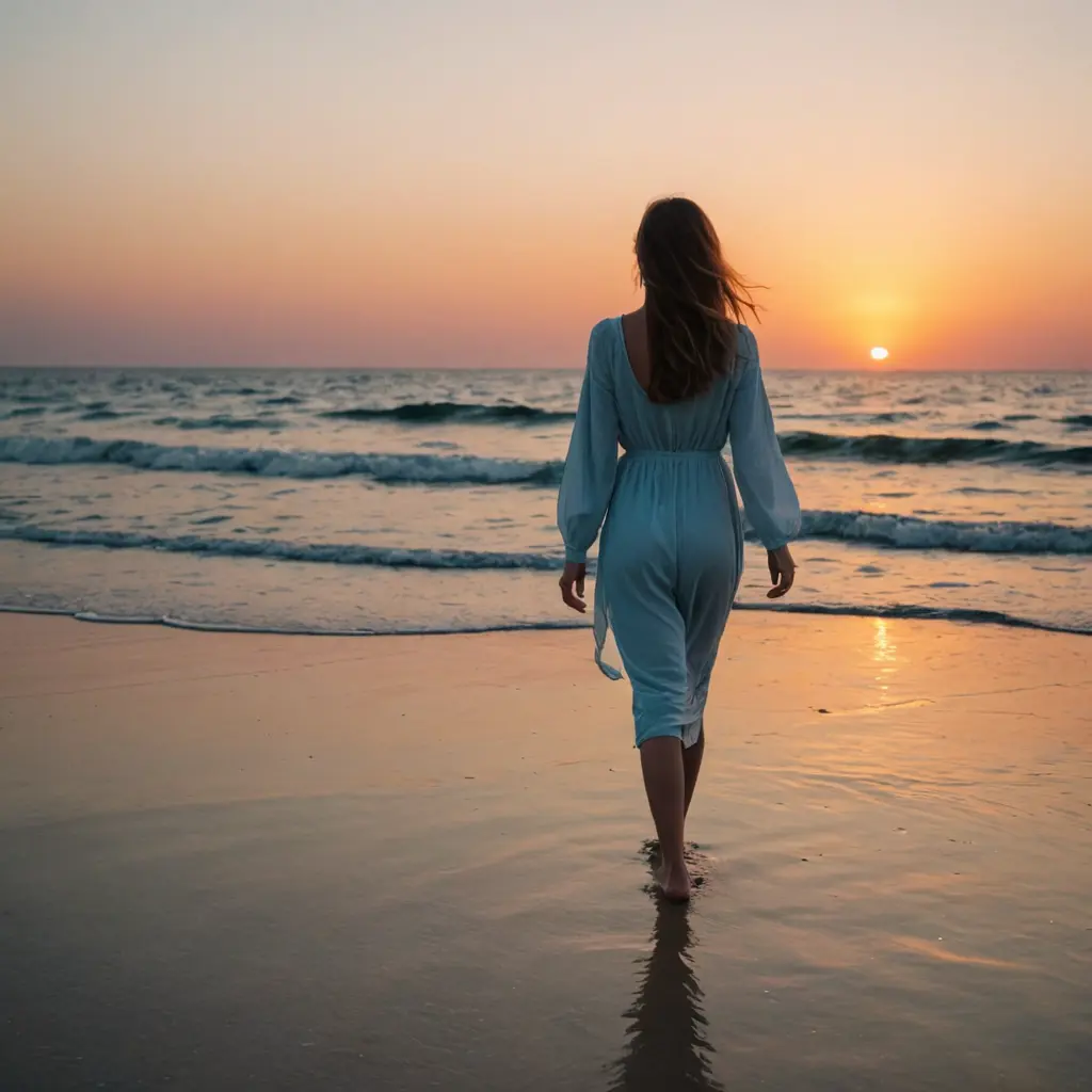 بنت تمشي على البحر حافية عند غروب الشمس