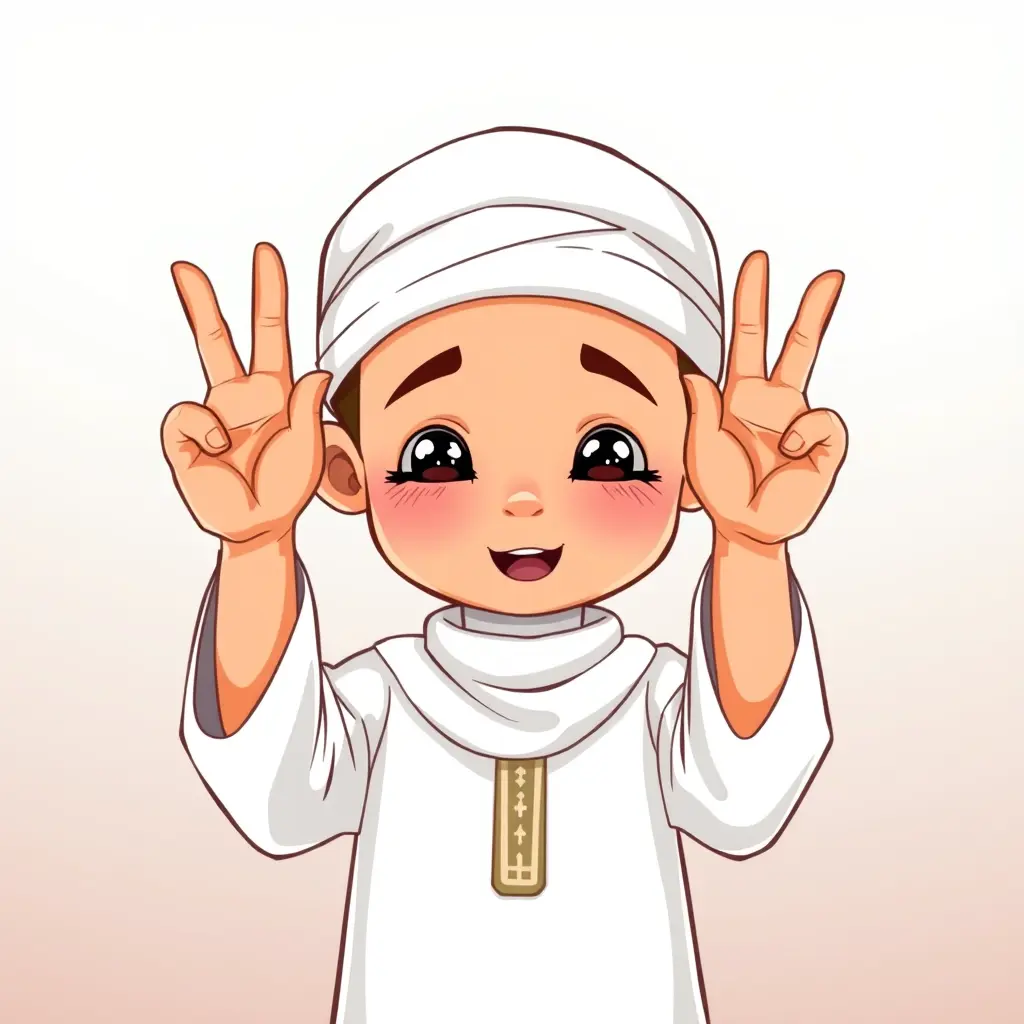 صورة كرتونية طفل مسلم، يرتدى جلباب ابيض باكمام طويله يقف خشوع وتضرع يرفع ست اصبع من يدية