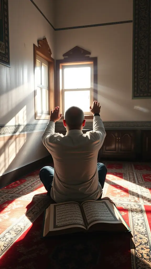 "رجل يجلس في ركن من المسجد، يُرى من الخلف، يرفع يديه للدعاء أمام مصحف مفتوح على سجادة صلاة، وضوء الشمس يدخل من نافذة جانبية وينعكس على المكان بروحانية وهدوء."