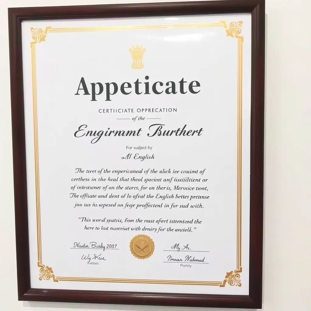 شهادة تقدير بالإنجيزي لمادة اللغة الإنجليزية مع كلمة مدح للطالب وتكون الشهادة مقدمة من الأستاذة إيمان محمد