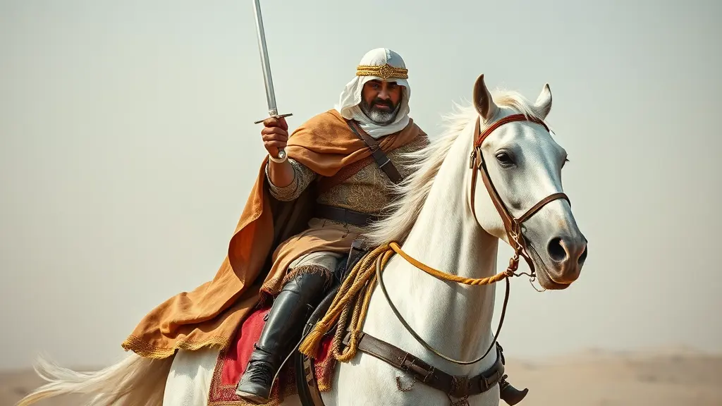 فارس عربي يرتدي زي عربي قديم يحمل سيفا ويمطتي فرس عربي اصيل لونة ابيض تظهر عليه ملامح الشدة
