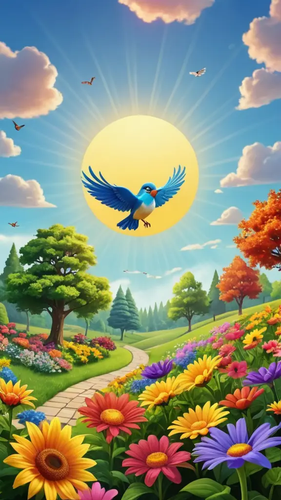 عصفور صغير يطير في السماء فوق حديقة مليئة بالاشجار والازهار الملونة وخلفه شمس مبتسمة وبعض الغيوم كرتون4d