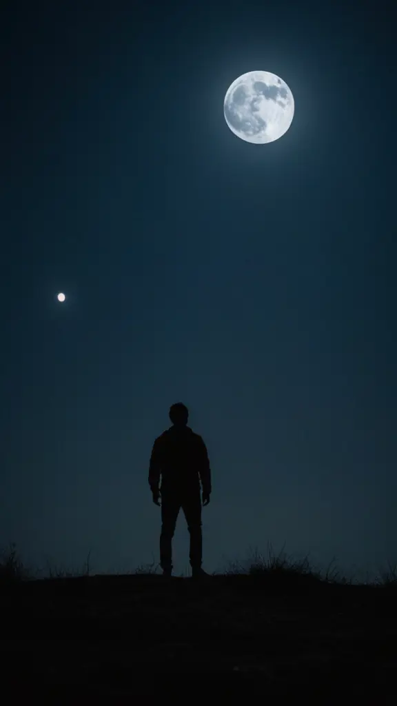 صورة عميقة لشخص يقف في الليل بأحباط و يسقط عليه ضوء القمر و تظهر تفاصيل القمر