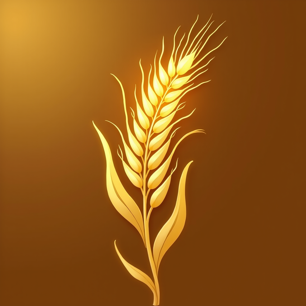 سنبلة ذهبية واقفة ، كل حبة قمح في السنبلة متلألئة وكأنها مشعة بنور خفيف، مما يرمز إلى البركة. تفاصيل السنبلة واضحة ودقيقة، مع انعكاس الضوء على حبوب القمح ليظهر جمالها ورمزيتها.