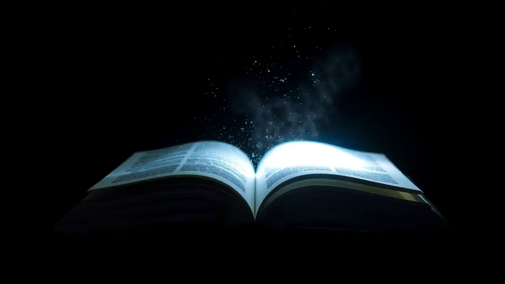 كتاب مفتوح يخرج منه نور ساطع، يضيء محيطه في خلفية سوداء مظلمة. الإضاءة تنبع فقط من صفحات الكتاب، وتنعكس بشكل جميل على الغبار الطائر في الهواء، مع أجواء غامضة820 × 360 بكسل