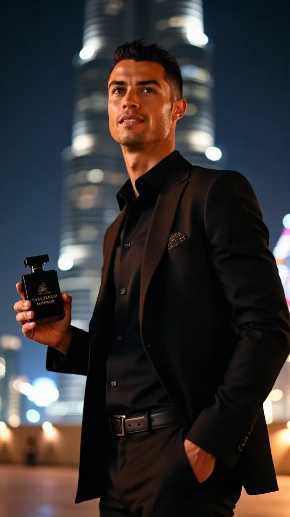 كريستيانو رونالدو يرتدي بدله سوداء و قميص اسود في دبي أمام برج خليفه في أجواء ليله و يحمل في يده زجاجه عطر سوداء مستطيله مكتوب عليها HAZEM ALMAHDI