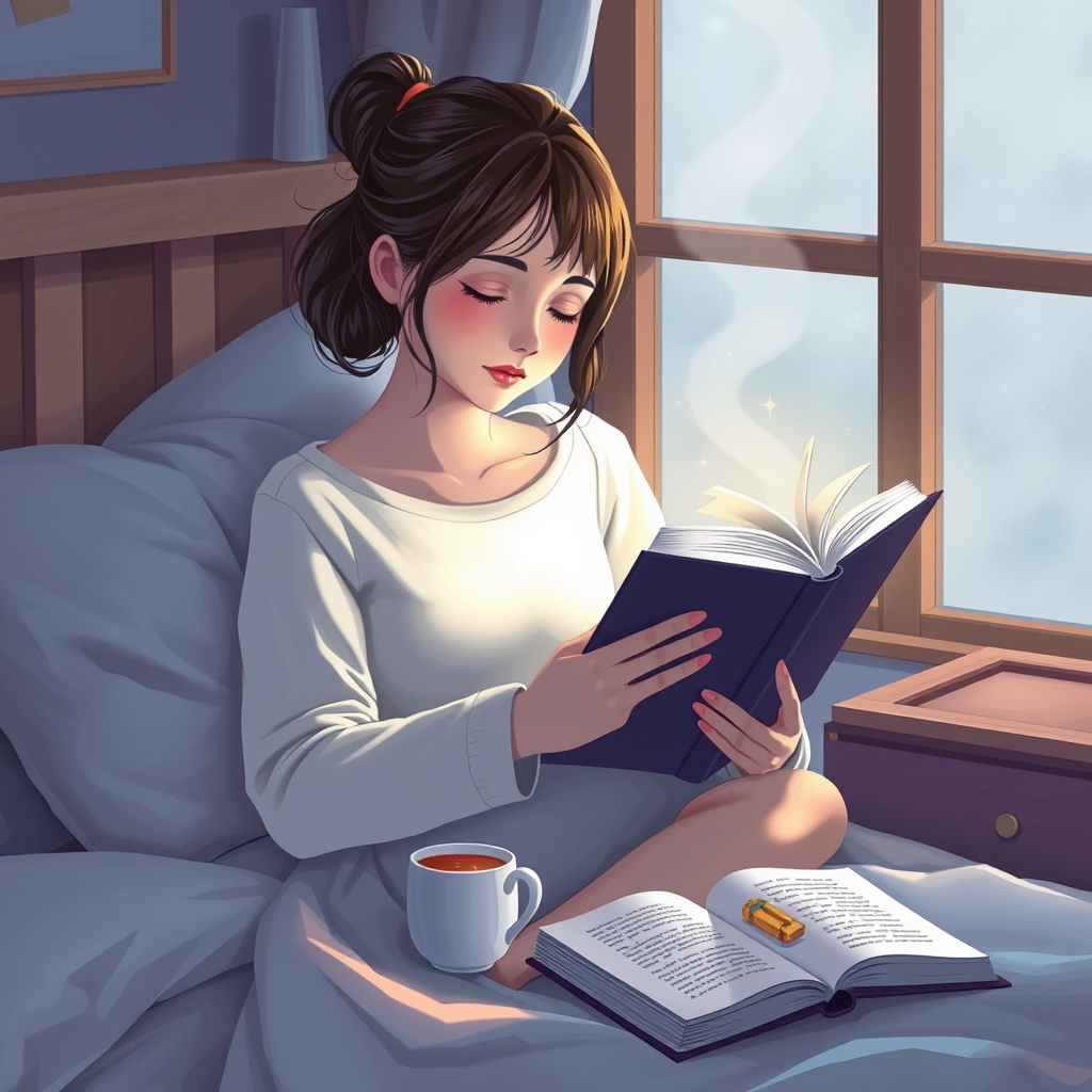 صورة لفتاة تقرأ كتاب قبل النوم في جو مريح وهادي مع كوب شاي ساخن
