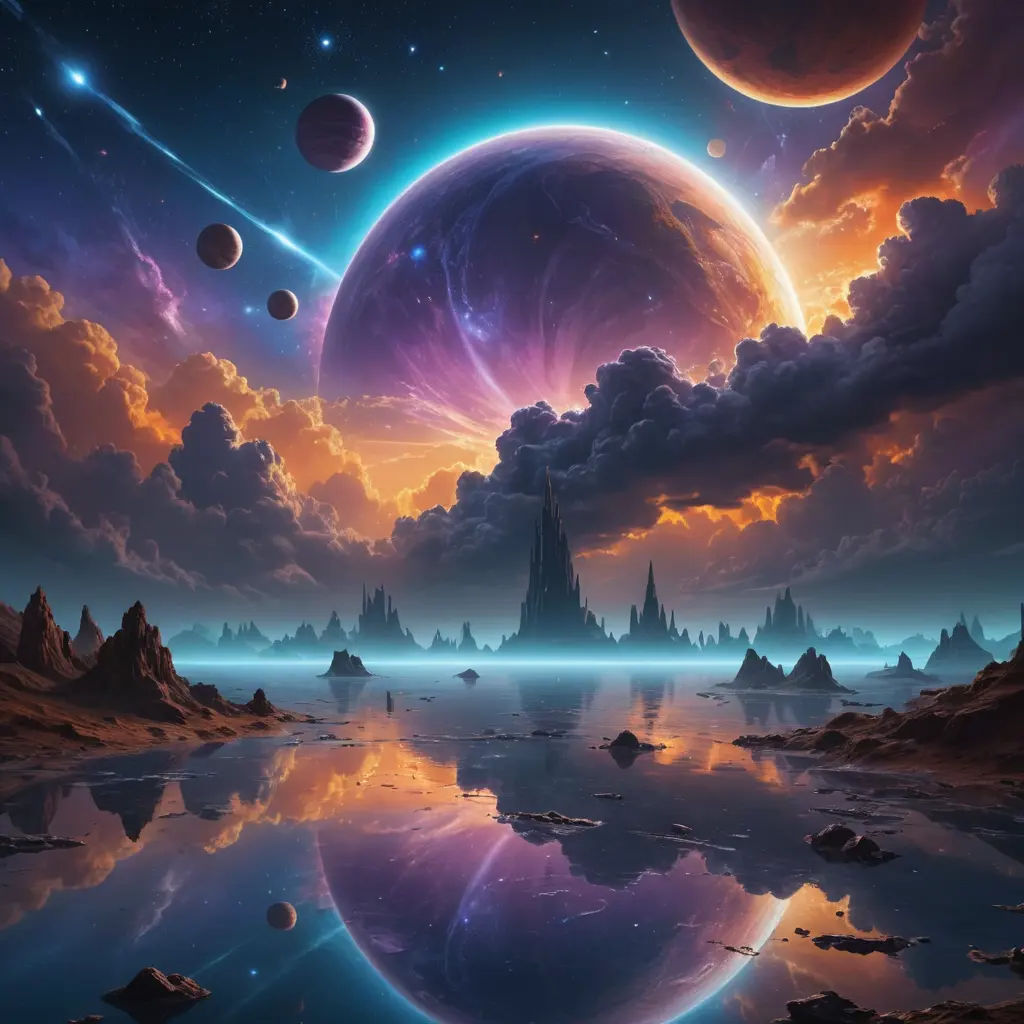 "مشهد خيالي سريالي يعكس عالمًا غامضًا وساحرًا، حيث يظهر [كوكب ] وسط سماء كونية مليئة بالكواكب والنجوم اللامعة. المشهد مضاء بألوان متدرجة من الأزرق، الأرجواني، والبرتقالي، مع سحب مضيئة تعكس وهجًا دافئًا. يظهر انعكاس السماء والكواكب على سطح ماء هادئ، مما يضيف بعدًا عميقًا وسرياليًا. الإضاءة درامية مع أشعة ذهبية تخترق الغيوم، مما يخلق إحساسًا بالحلم والخيال اللامحدود." اريدها بشكل خيالي كارتوني غير واقعي ولا تجعلها ذات لون برتقالي جداً اجعلها ذات لون ازرق مائل الى الارجواني والزهري بل أكثر