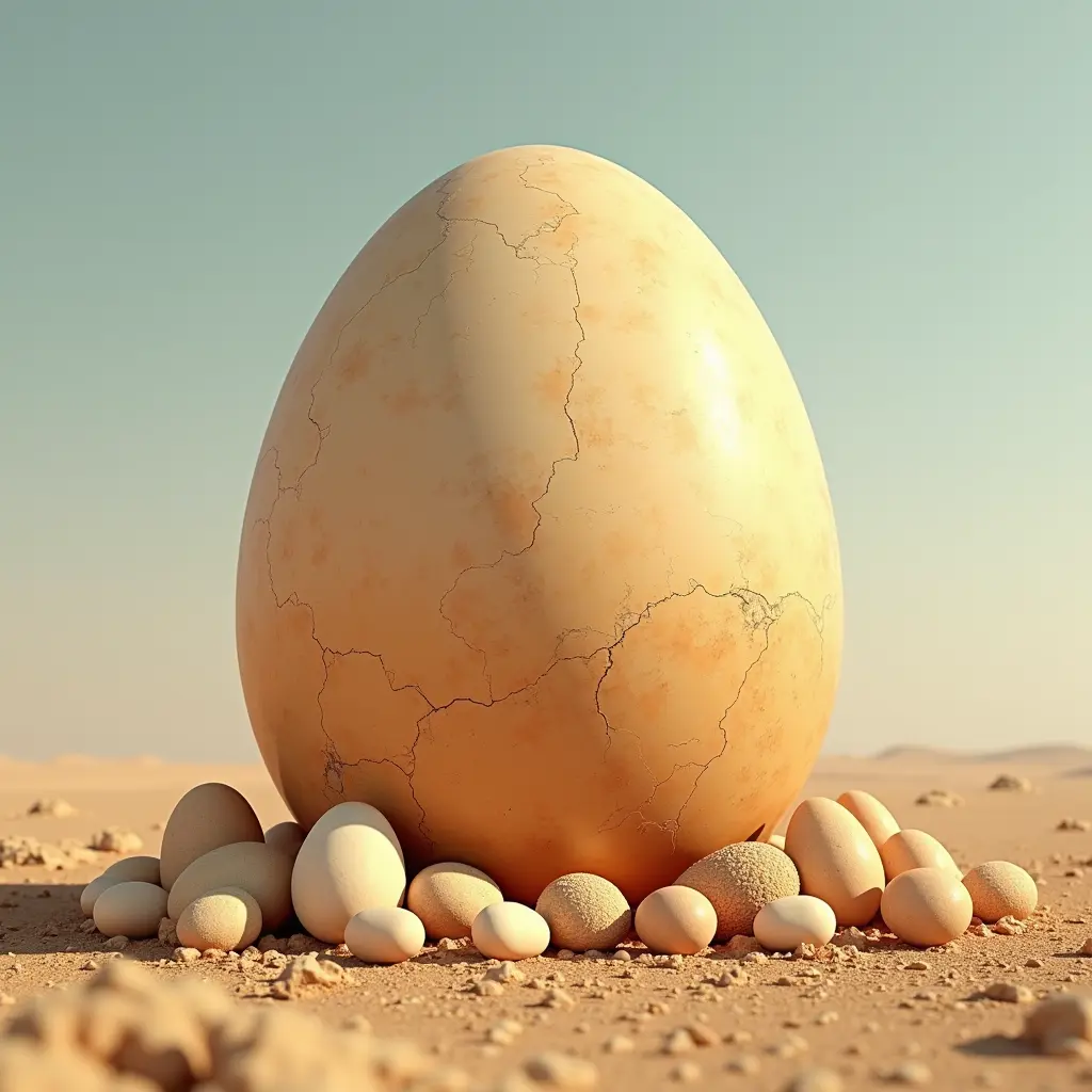 صورة بيضة عملاقة جدا جدا في صحراء مع وجود اعداد كبيرة من البيض الصغير بجانبها