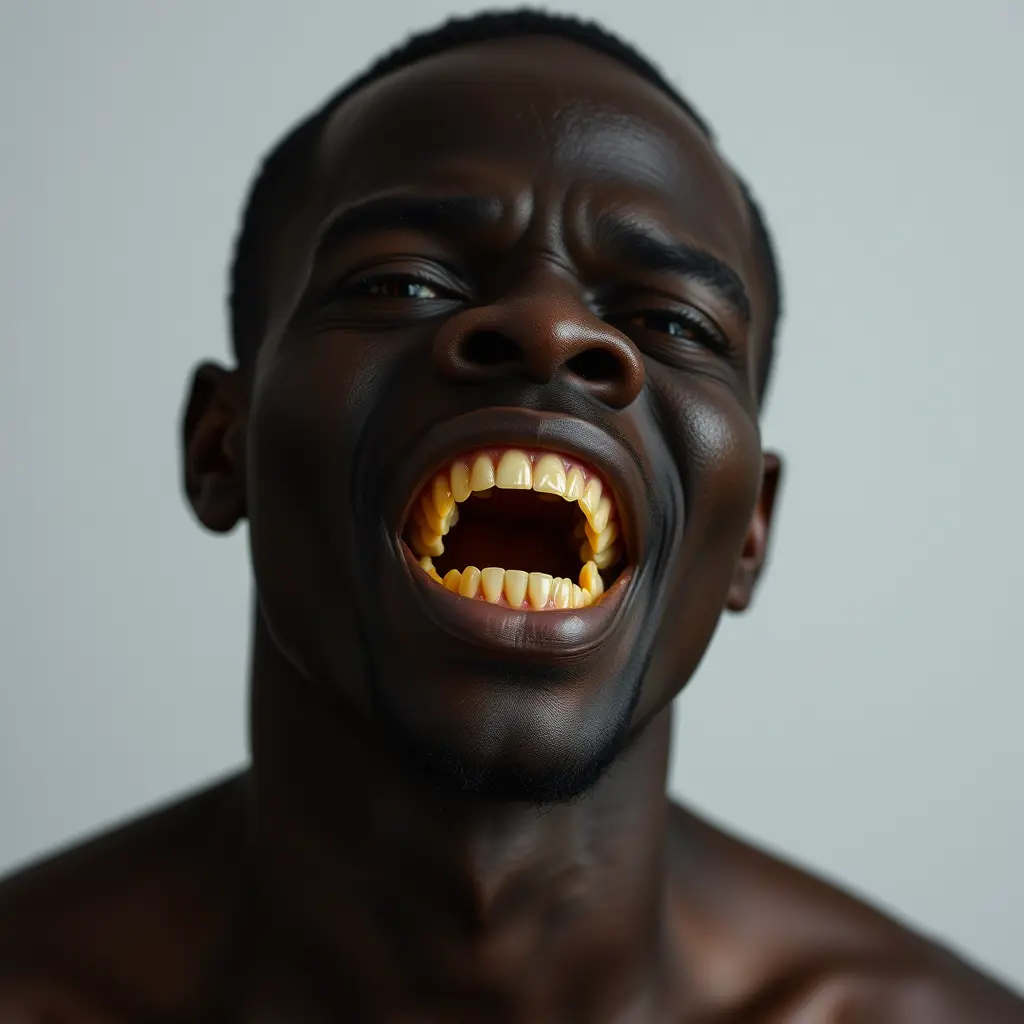 شخص اسود مع اسنان صفراء وعضلات لاتس كبيرة