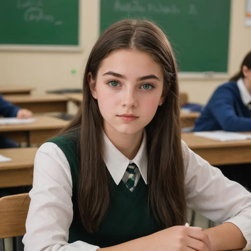 بنت في عمر ال٢١ بعيون خضراء اسمها فاتنه تجلس على مكتب مدرسه
