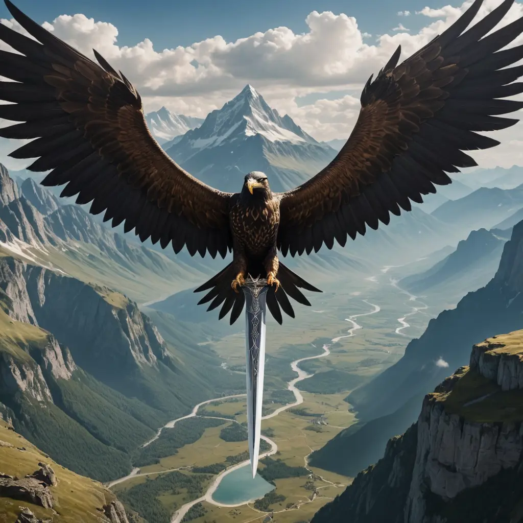 سيف حربي مقلوب علية اجنحة صقر مفرودة وجبال وسهول