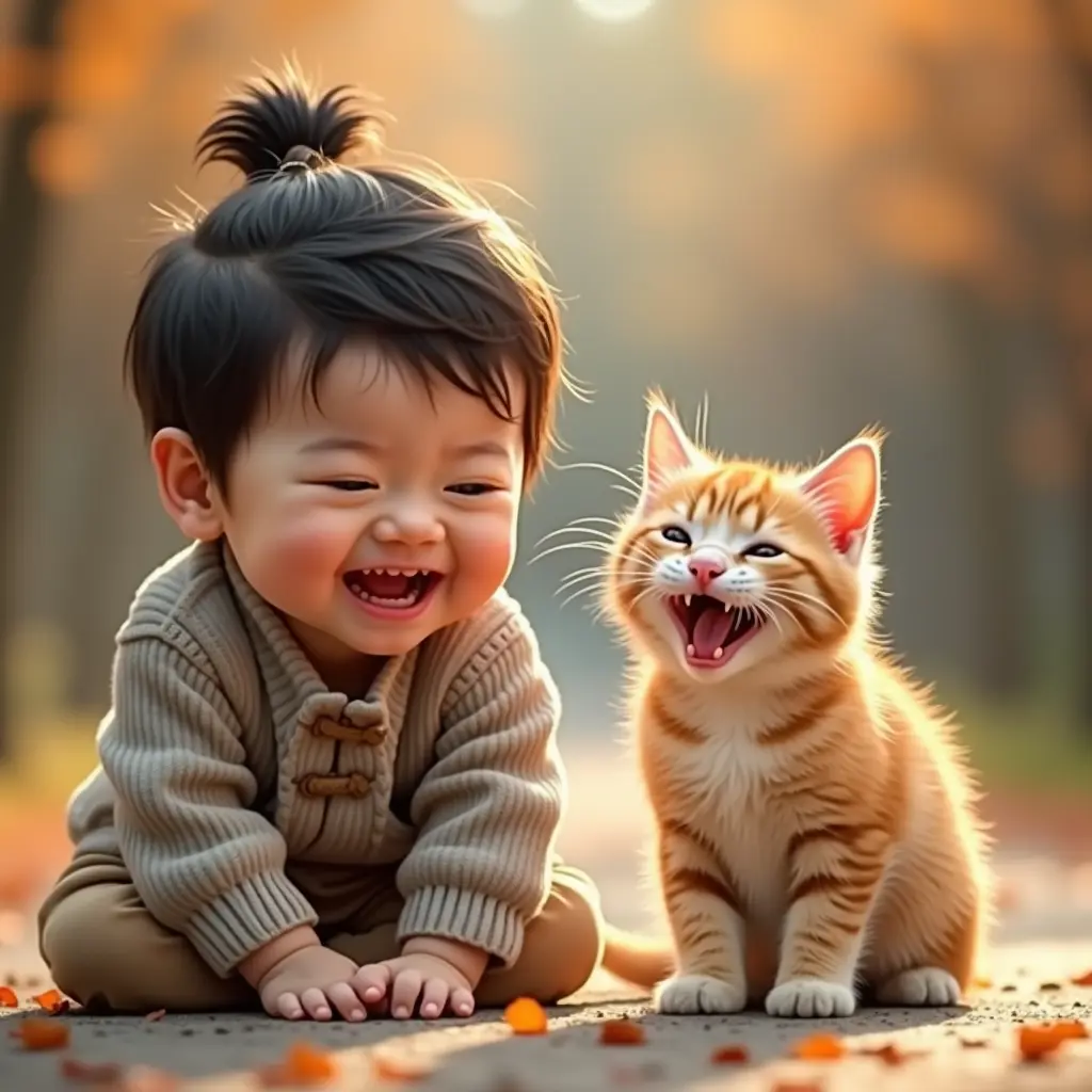 طفل صيني جميل يضحك وبجانبه قطة ظريفة تضحك أيضا