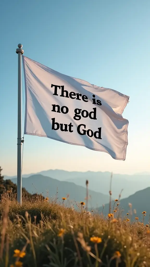 اريد جملة لا إله الا الله مزخرفة على علم ابيض (علم التوحيد الابيض) اوريدها مرفوعة على شيئ وامامها منظر طبيعي جميل تناسب خلفية شاشة للموبايل