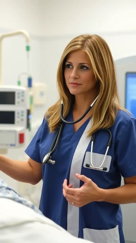 Actress Jennifer Aniston is seen in a doctor's uniform while examining a patient's chest with a stethoscope in a hospital's intensive care unit.