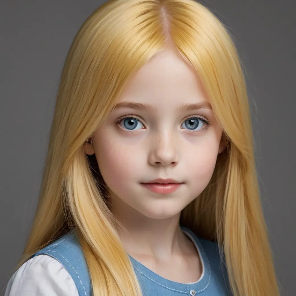 ارسم لي بنت شعرها اصفر طويل ومفرود وعينيها واسعه ولونها ازرق مباشرتها بيضاء وجميله وتكون في عام ثمان سنوات اجعلها بنت واقعيه