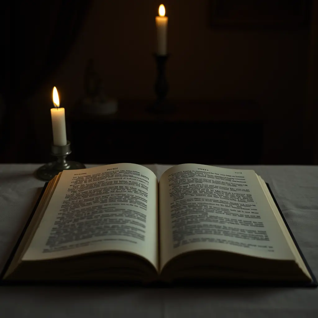 صورة كتاب مفتوح على طاولة والورقة في الكتاب واضحة والغرفة ضلام ويوجد بجانبه شمعة  اريد زاوية الصورة من فوق اي ان ورقة الكتاب تكون كاملة امام الصورة اريد الورقة موضحة اكثر وزاوية الصورة من فوق اريد الصورة تصور الورقة من فوق وليس من تحت