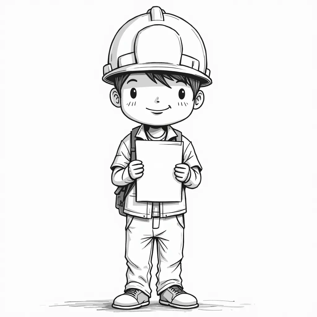 سكدش رسم  بسيط لشاب عمره ١٩ مهندس يرتدي خوذه ويحمل حزمه صغيره من الورق الوجه الى الامام
