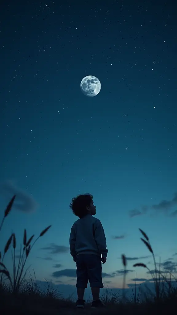 طفل ينظر إلى النجوم والقمر في ليلة صافية، متسائلاً عن خالق الكون.