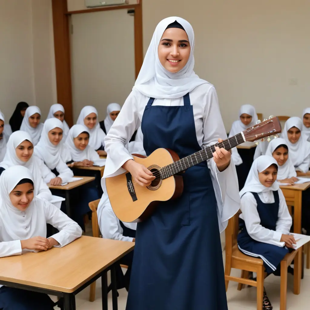 ارسم لي طالبة مدرسه عمانيه في الصف ١١ نرتديه مريول مدرسي كحلي مع قميص ابيض باكمام طويله ساتره و حجاب ساتر و لديها بشره بيضاء و ممسكه بقيثارة و تعزف في يديها وورائها عده طالبات بنفس مواصفات ملابسها و يصفقون لها و مرتديين مريله زرقاء بداخلها قميص ابيض ساتر و حجاب ابيض