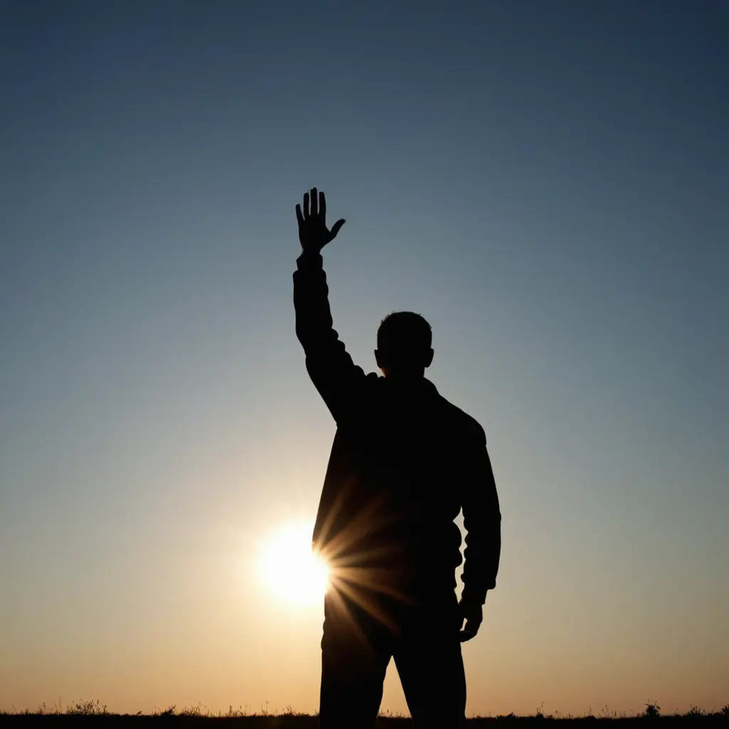 صورة ظل رجل في ظل الشمس في الشروق رافع رأسه الى السماء يتضرع