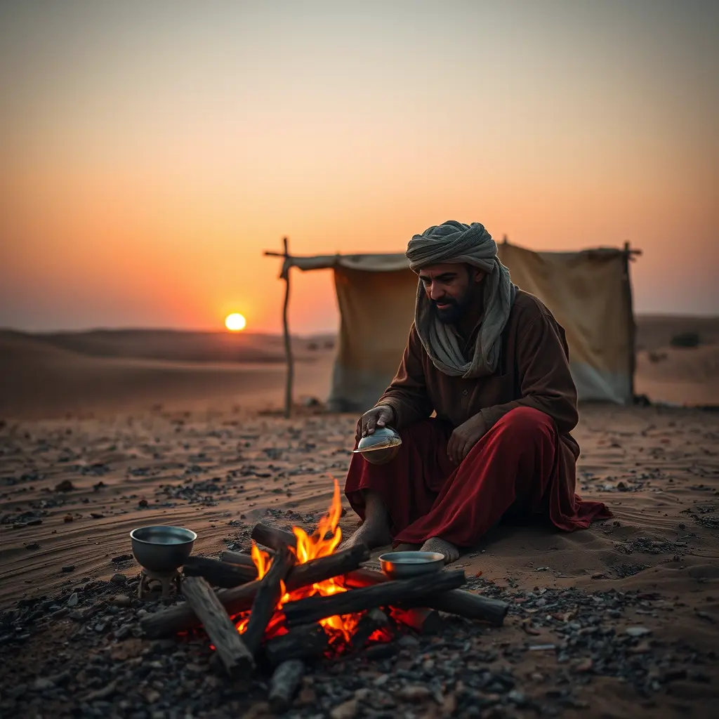 بدوي عند الغروب في الصحراء يحضر الشاي على الحطب بالقرب من بيته
