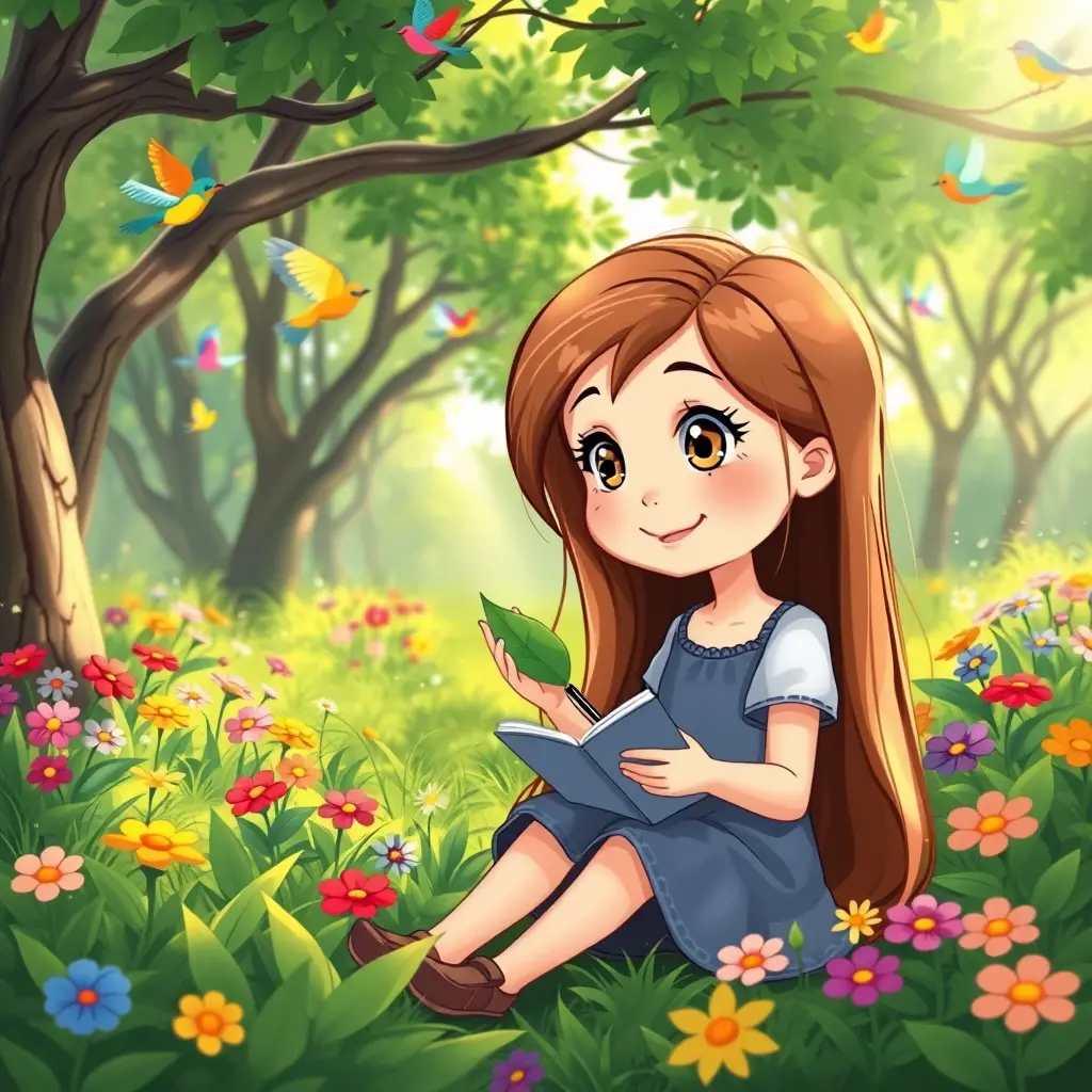 " صورة كرتونية فتاة صغيرة ذات شعر بني طويل، تجلس في حديقة خضراء مليئة بالأشجار والزهور الملونة، تلمس ورقة شجرة بإعجاب. تبدو متأملة وسعيدة، تحمل دفترًا صغيرًا وقلمًا، مستعدة لرسم ما تراه. في الخلفية، هناك طيور ملونة تحلق، وأشعة الشمس تتخلل أوراق الأشجار."