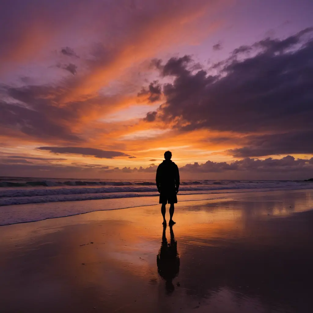 صورة ظلية لرجل عند غروب الشمس، سماء مثيرة، عدسة واسعة الزاوية، تباين عالي، برتقالي وأرجواني نابض بالحياة، إعداد الشاطئ