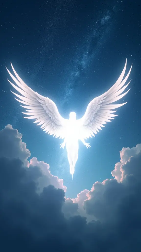A vast night sky filled with sparkling stars. A majestic luminous angelic figure (Gabriel) made of pure light, with enormous radiant wings extending across the horizon. Surrounding him are waves of white and blue light, as he delivers God’s command. The scene feels heavenly and awe-inspirin