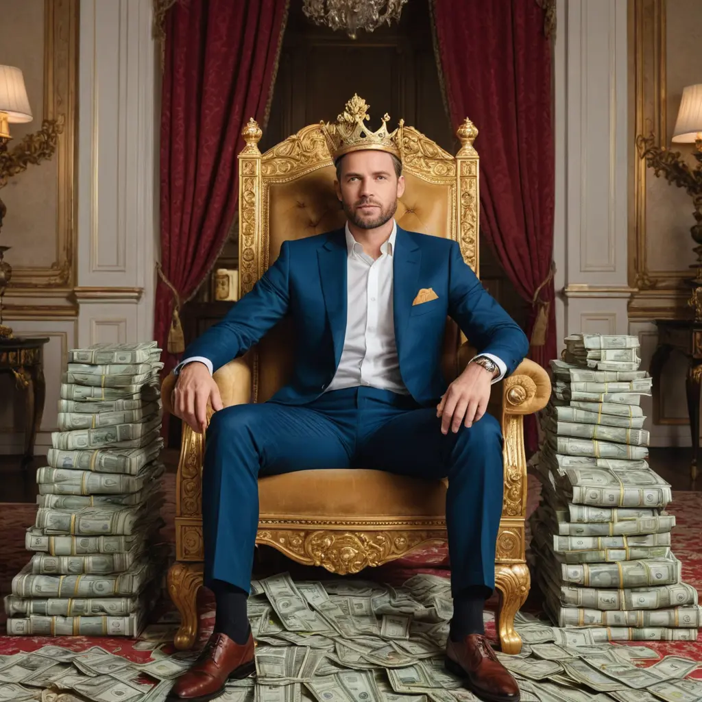 رجل غني جدا يجلس على كرسي ملكي على رأسه تاج من ذهب في غرفة ممتلئة بحقائب من المال
