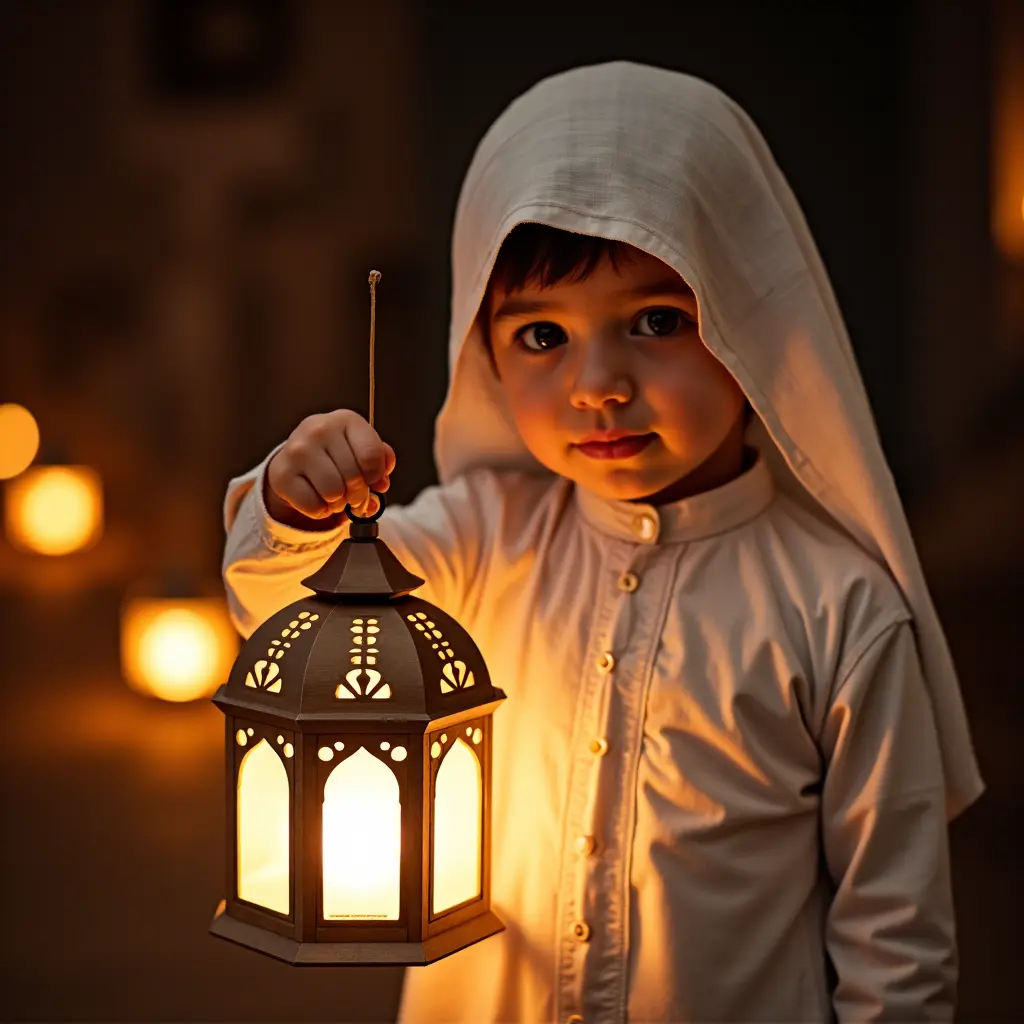 صورة طفل عمرة سنتين يرتدي جلباب ابيض ويحمل فانوس رمضان والأجواء رمضانية واحتمالية
