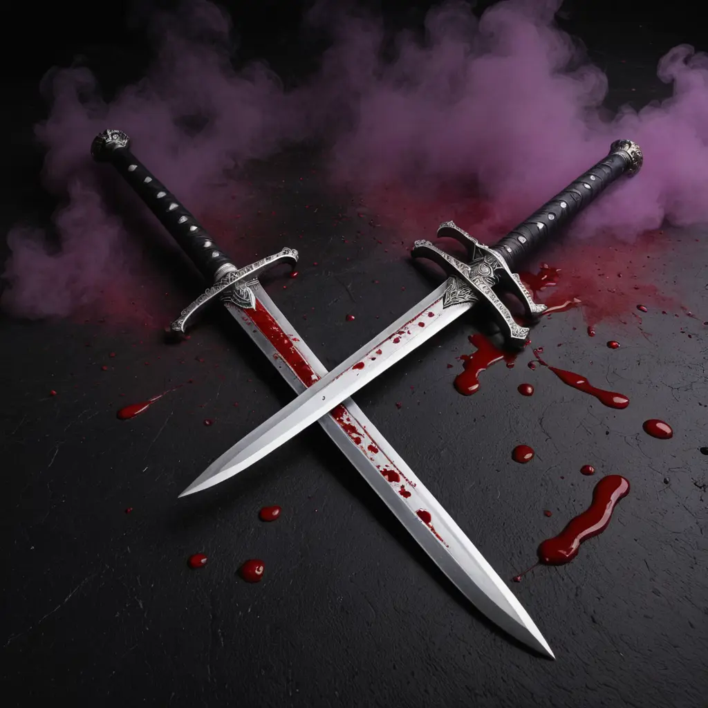 خلفية سوداء، سيفين باللون الفضي مع قطرات الدم، قطرات دم على الارض، دخان بنفسجي اللون