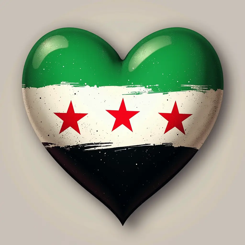 صورة قلب موضوع عليه العلم السوري الذي يتكون من اللون الأخضر في الجزء العلوي والأسود في الجزء السفلي وثلاث نجوم حمراء في المنتصف