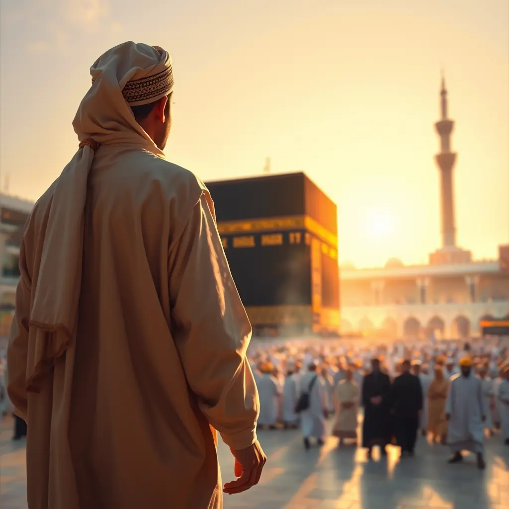 حاجٌّ يرتدي ملابس الإحرام، يسير نحو المسجد الحرام في مكة المكرمة، والكعبة المشرفة في الخلفية. المشهد عند شروق الشمس، يُلقي ضوءًا ذهبيًا دافئًا على الأحجار المقدسة والمناظر الطبيعية المحيطة. الهواء منعشٌ ويفوح برائحة البخور. التقط هذه اللحظة بأسلوب لوحة رقمية مُفصّلة، تُركّز بشدة على ملابس الحاج والهندسة المعمارية المُعقدة للكعبة، مع تفاصيل ضبابية، وإن كانت واضحة، لفناء المسجد الصاخب في الخلف.