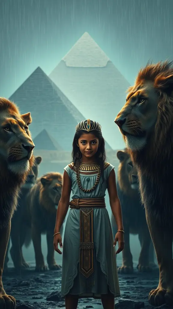 صورة فتاه تقف بتحدي ملامح مصرية ويوجد اسود شرسة في كل مكان حول الفتاهوخلفه برج اهرامات الجيزة في اضاءة ليلية و المطر يمطر بغزارة في مشهد سينمائي