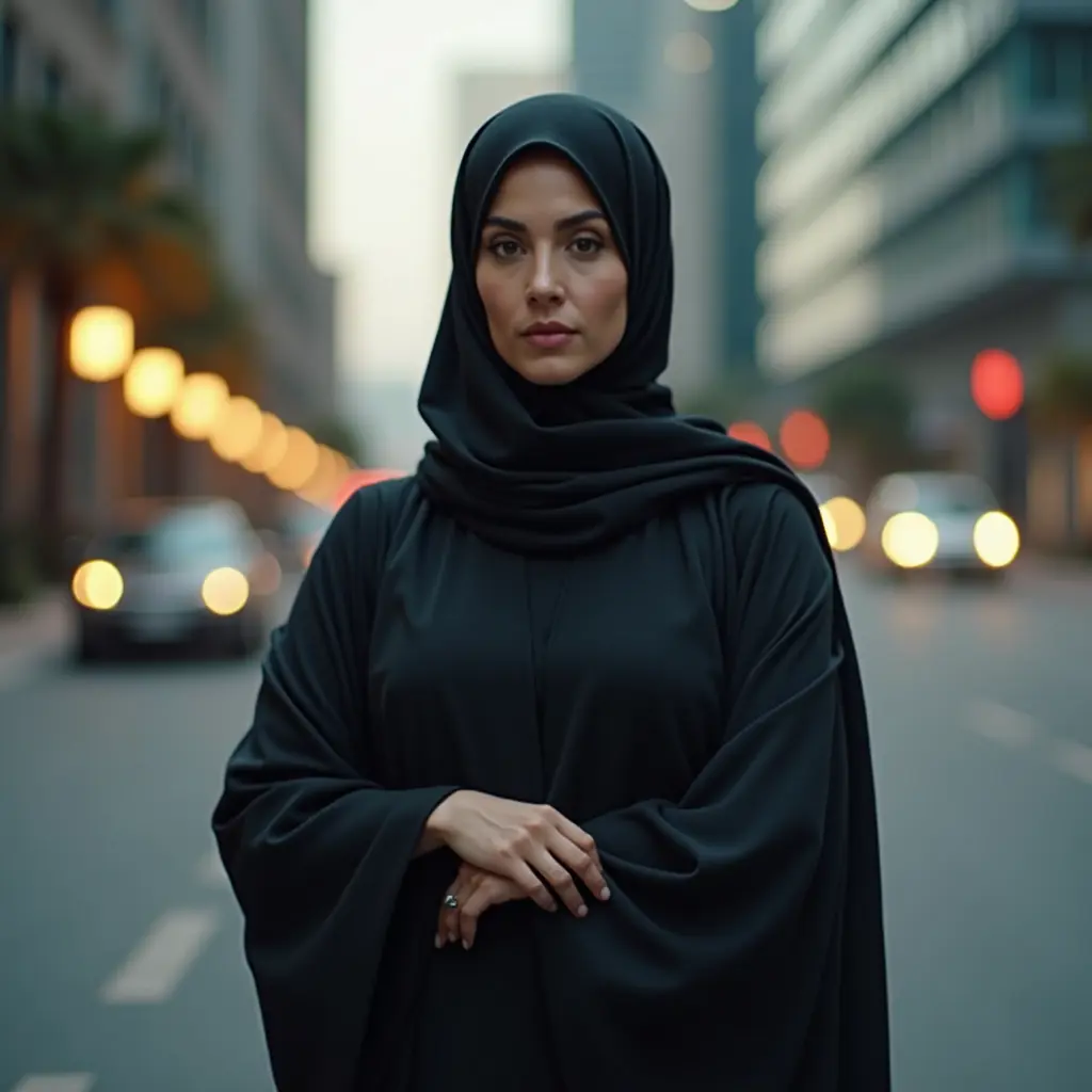 امرأة محجبة في أوائل الأربعينيات من عمرها، تقف بثقة مرتدية عباءة تقليدية وحجابًا، تظهر فخذيها العاريتين تحت قماش أبيض منسدل. في مشهد حضري، تزينه عمارة حديثة في الخلفية، وتضفي أضواء المدينة إشراقة دافئة على المشهد. تُجسد الصورة أناقة المرأة وقوتها، بتركيز ناعم وواضح يُبرز حضورها. الأسلوب: صورة سينمائية، بنبرة خالدة وجليلة.