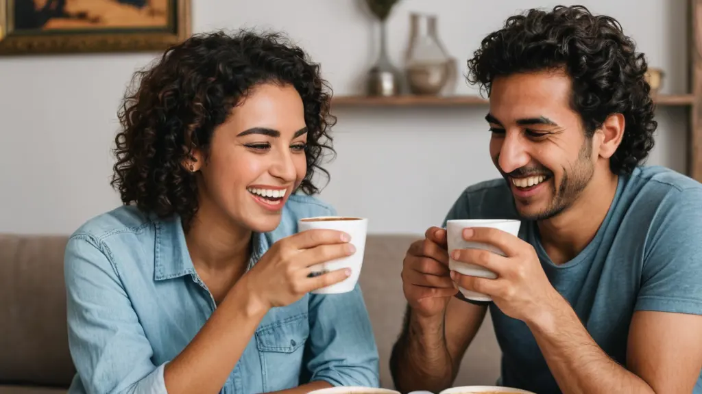 اثنين أصدقاء مصريين يشربون القهوة التركية معا وهم يضحكون