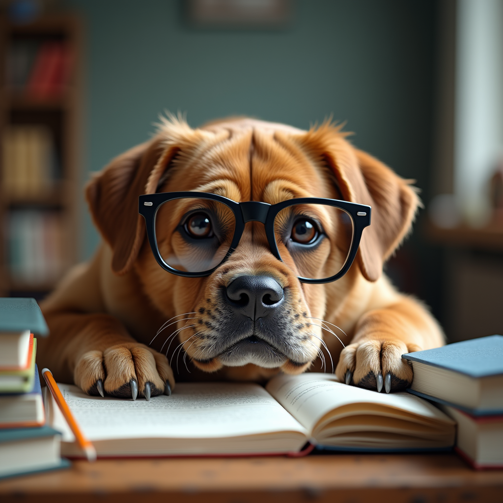 كلب حزين يرتدي نظارة مذاكرة يدرس للامتحان على مكتبه وامامه الكثير من الكتب