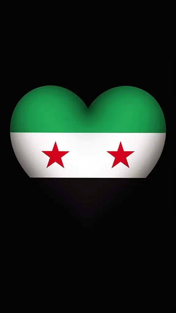 قلب على شكل نسر الشاهين عليه علم سوريا الجديد الذي الوانه من الاعلى اخضر ومن الاسفل اسود ومن المنتصف فراغ ابيض فيه ثلاث نجوم حمراء والخلفية سوداء
