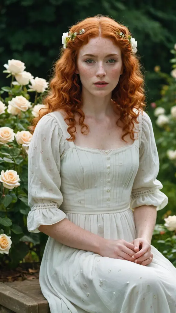 امرأه صهباء بشعر مجعد وبشرة بيضاء مغطاة بالنمش باعين خضراء ترتدي ثوب ابيض يظهر كتفها بورود صغيرة تجلس وسط حديقه من العصور القديمه