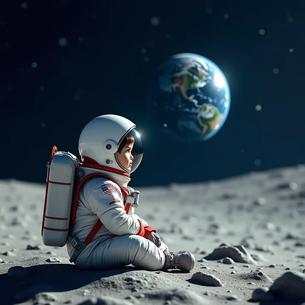 رائد فضاء طفل يجلس على القمر وينظر لكوكب الارض