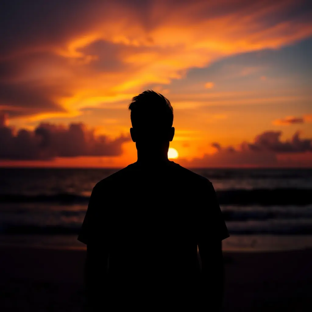 صورة ظلية لرجل عند غروب الشمس، سماء مثيرة، عدسة واسعة الزاوية، تباين عالي، برتقالي وأرجواني نابض بالحياة، إعداد الشاطئ